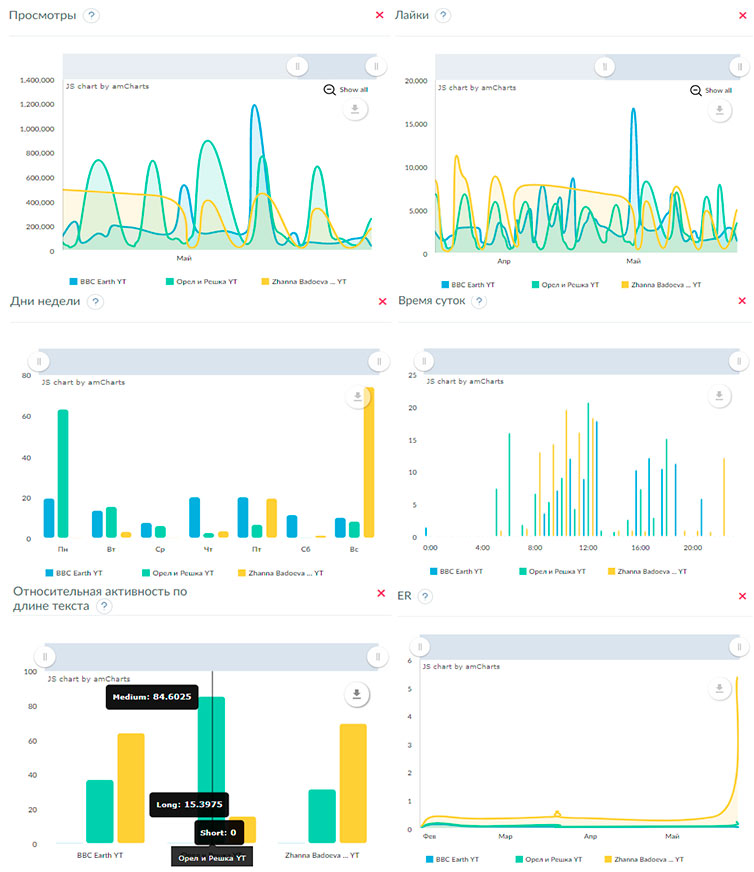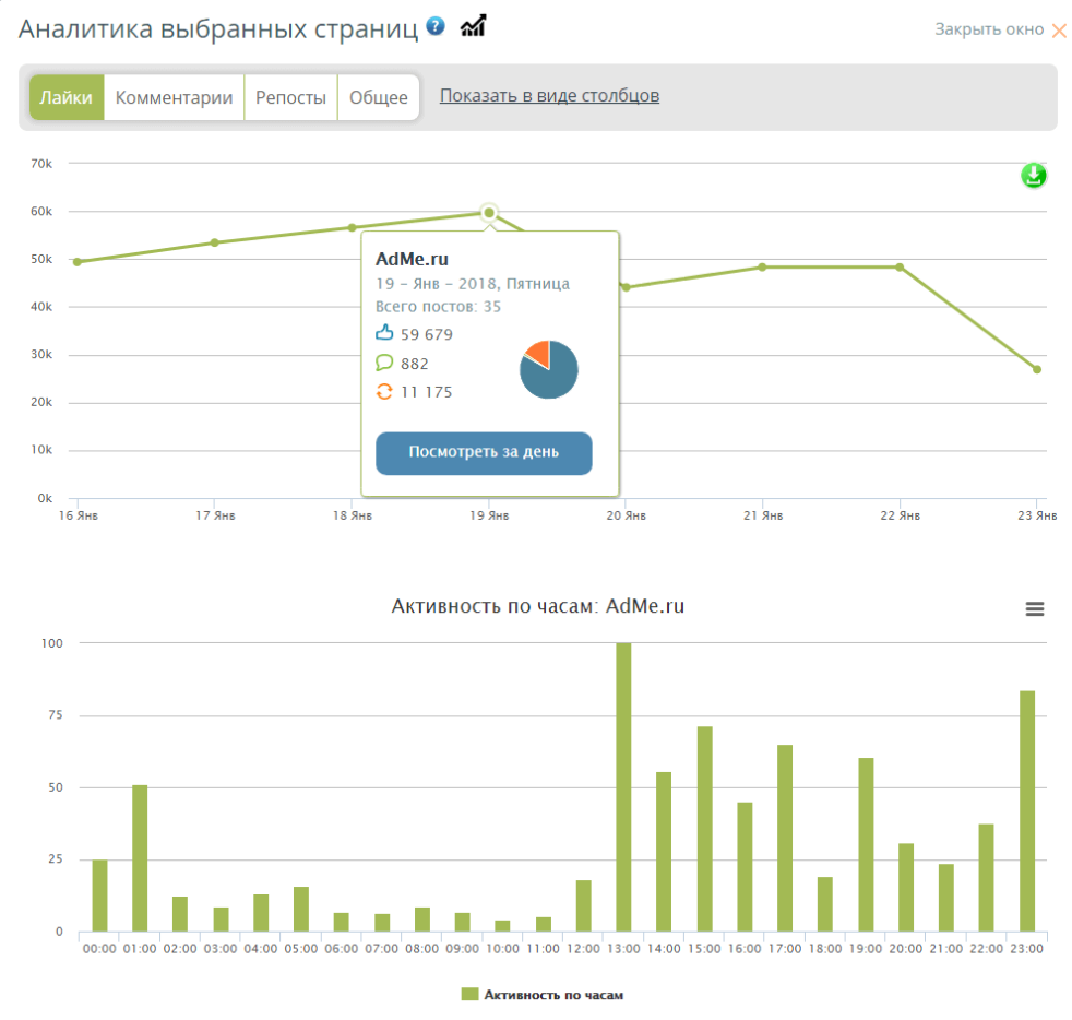- Отчеты по количеству лайков, комментариев и шеров, подписчиков в динамике.