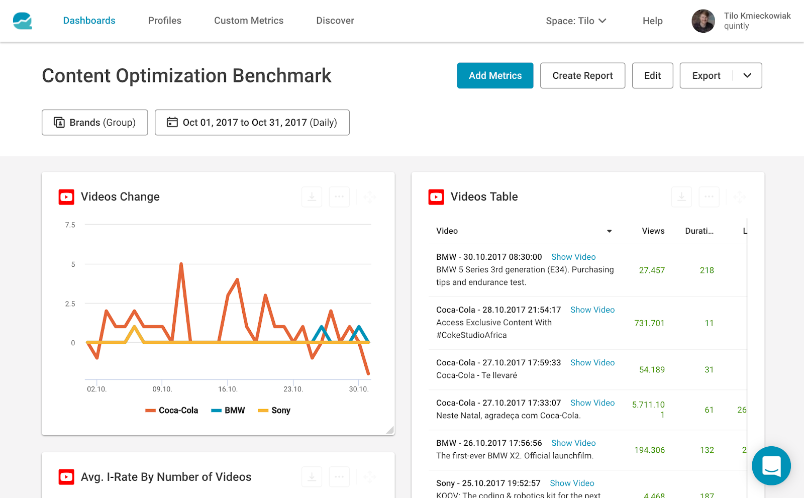 Quintly — платформа для аналитики соцмедиа и конкурентного бенчмаркинга. Целевая аудитория: бренды, агентства, СМИ. Можно подключить Instagram, Facebook, Twitter, LinkedIn, YouTube.