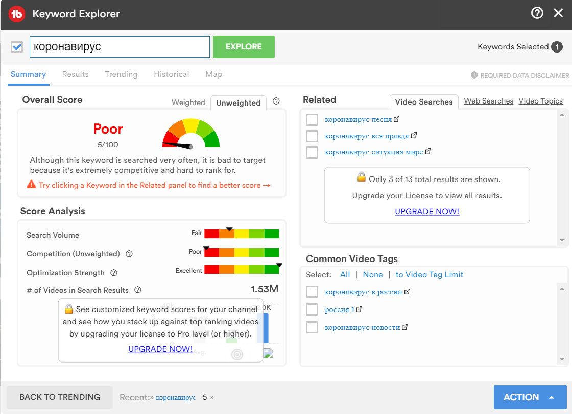 Keyword Explorer не рекомендует оптимизировать под ключ «коронавирус», так как он слишком часто используется. Логично