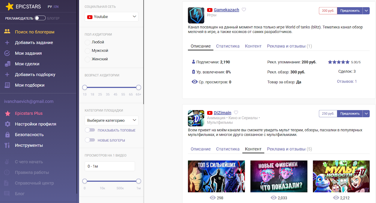 EPICSTARS — платформа, которая связывает бизнес и блогеров. В базе десятки тысяч площадок, микро- и наноинфлюенсеров. Поддерживается не только YouTube, но и Twitter, Facebook, VK, Telegram, Instagram.