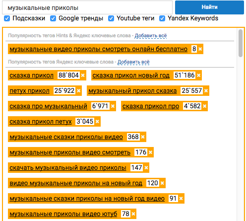 - Изучить теги любого видео: оценить их популярность с помощью Яндекс.Вордстата, посмотреть позицию видео в поиске по тегам. А также скопировать отдельные теги или все сразу.