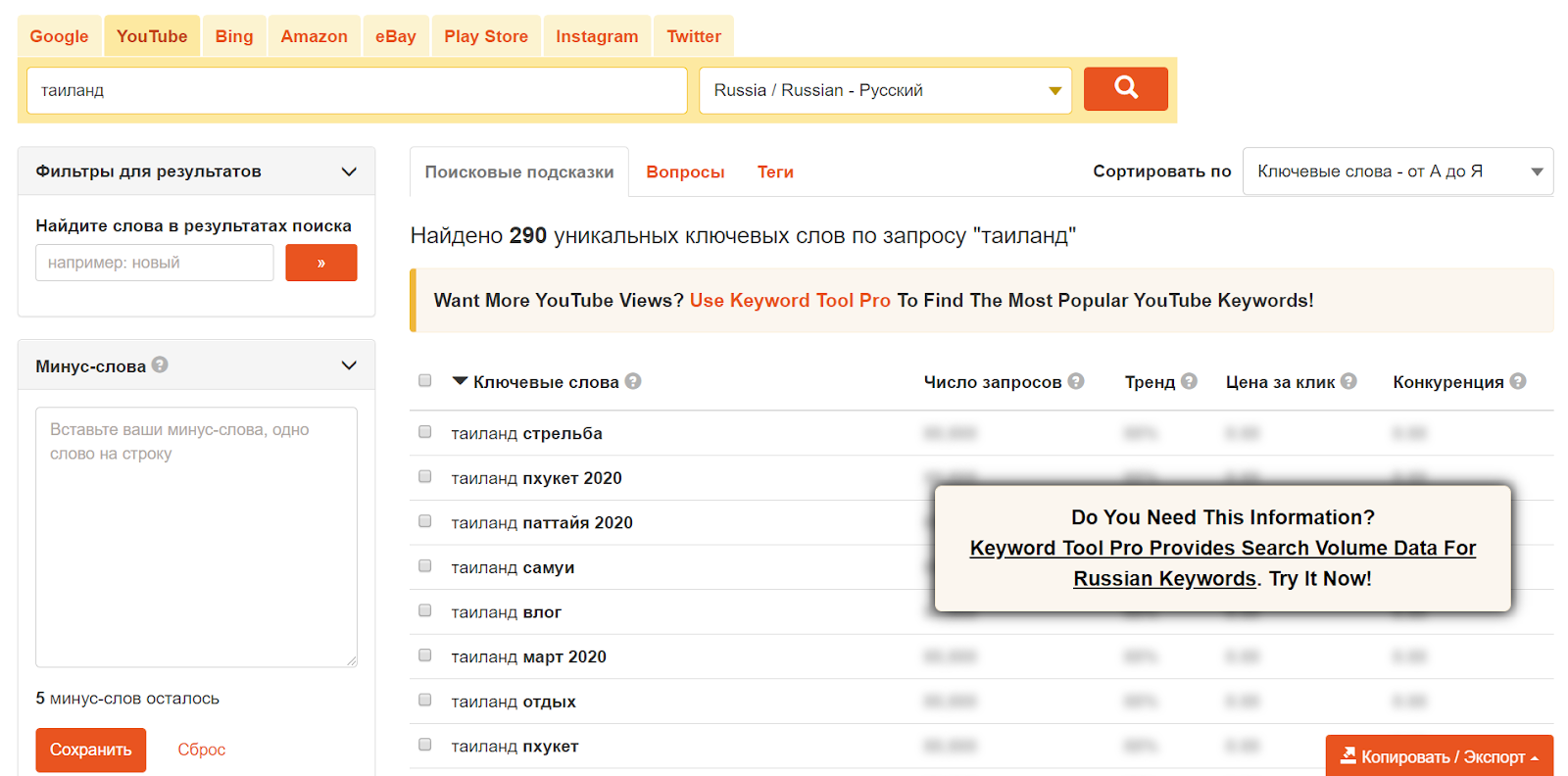 Keyword Tool — онлайн-сервис для составления семантического ядра. Умеет собирать поисковые подсказки Google, YouTube, Bing, Amazon, eBay, PlayStore, а также хештеги Instagram и Twitter. Русский язык поддерживается.