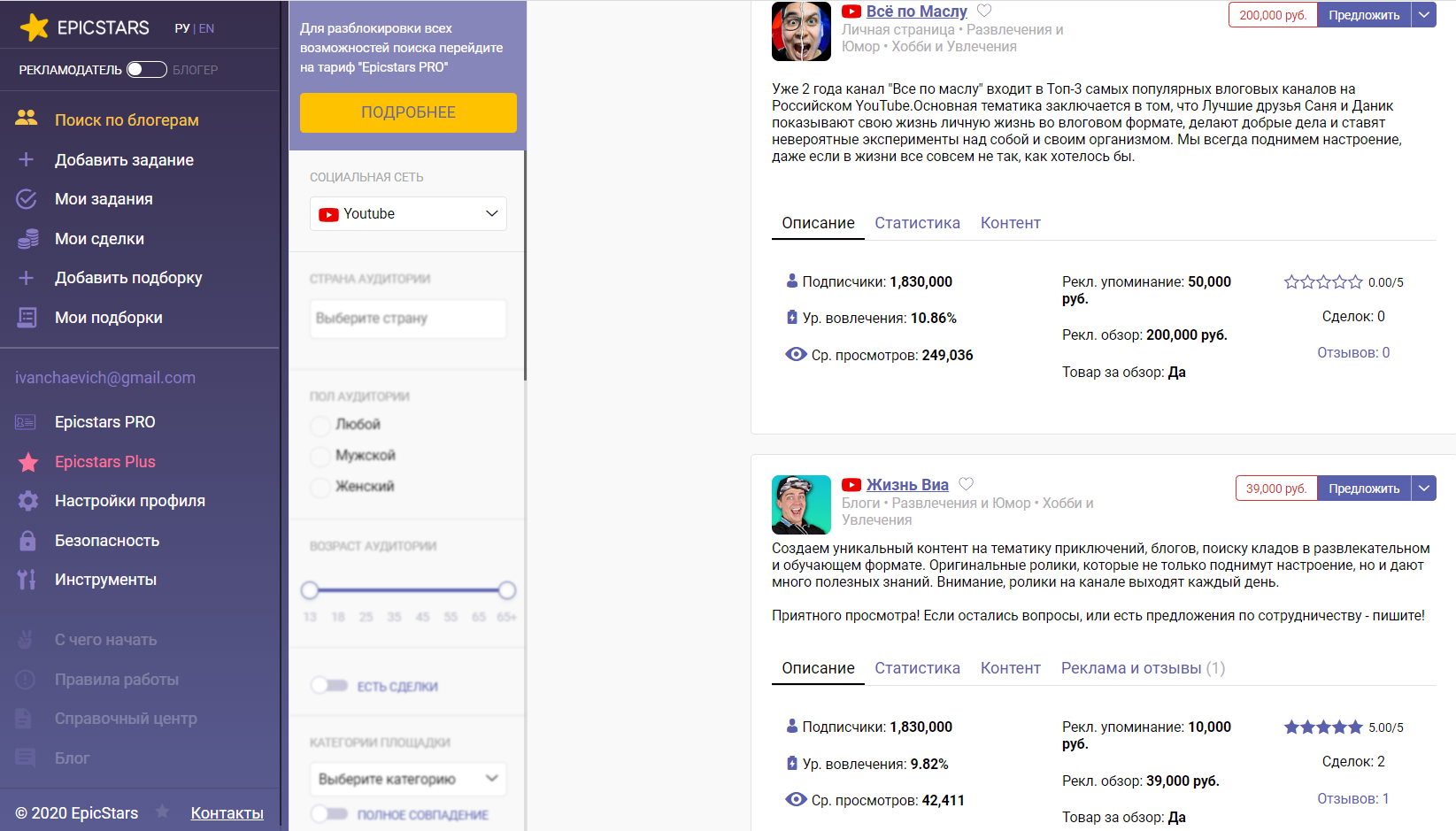 Для подробного анализа и безопасных сделок — EPICSTARS, Plibber, GetBlogger, Prolog.yt (платные биржи блогеров).