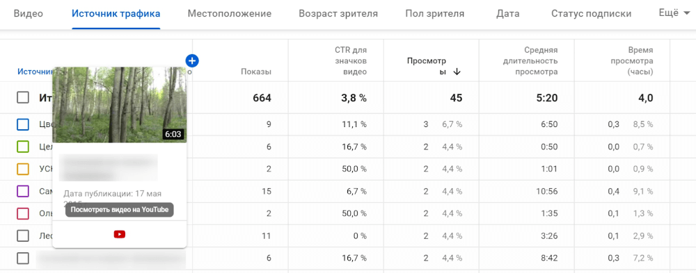 Снова нужен отчет «Творческой студии», только немного другой: «Источник трафика: рекомендуемые видео». Он показывает похожие тематические ролики, с которых зрители перешли на ваши. Каналы, на которых загружены такие видео, можно считать конкурентными – ведь у вас с ними общая целевая аудитория.