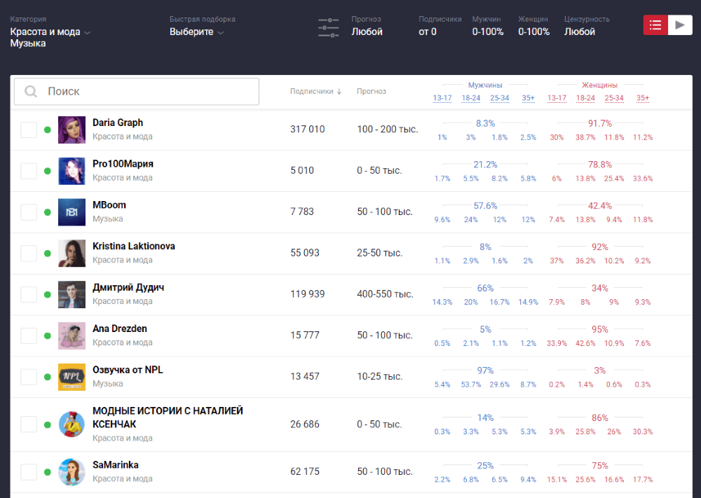 Как вариант – можно подобрать дополнительные каналы с помощью рейтингов (Whatstat, Livedune) и бирж (Epicstars, Vlogster, Prolog). В тематических рубриках первых можно найти топовых блогеров, у вторых – и середнячков, и новичков. Эти же инструменты пригодятся для анализа конкурентов.