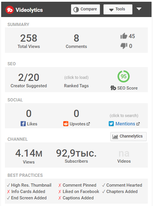 Такие инструменты также помогут собрать дополнительные, и, возможно, даже более важные данные. Например, скорость набора просмотров, количество подсказок и заставок, ключевые слова и теги, позиции в поиске, вовлеченность.