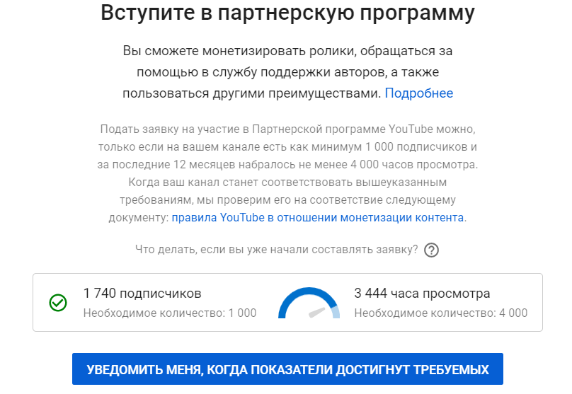Если эти условия выполнены, можно подавать заявку. Как правило, ее рассматривают в течение месяца. Если отклонят – можно попытаться еще через месяц. Раздел «Монетизация» в Творческой студии Ютуба заботливо показывает, где ок, а где еще нужно докрутить: