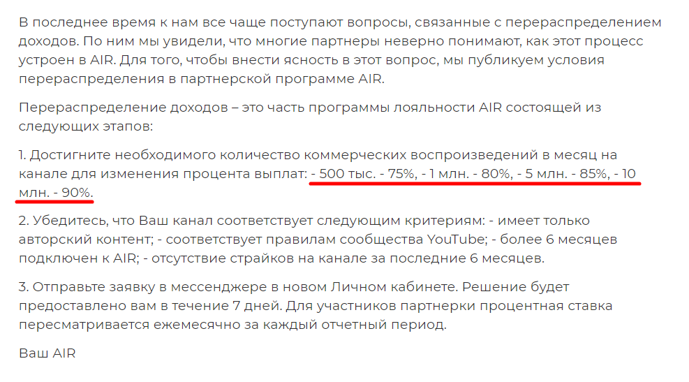 Если вы готовы работать через медиасеть – учитывайте, что, возможно, нужно будет набрать больше подписчиков и просмотров. Например, AIR подключают каналы только с 1 500+ подписчиками и 5 000+ часами просмотра.
