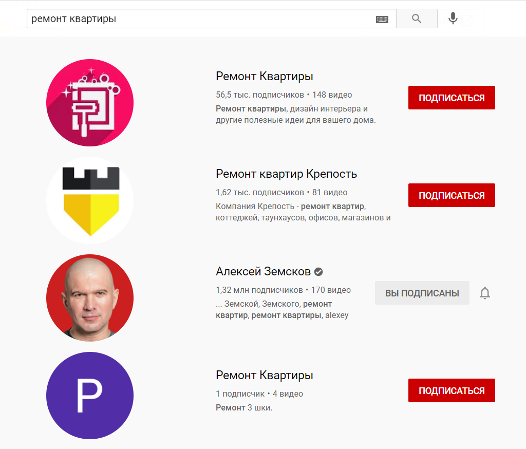 Поиск YouTube по каналам: у Алексея Земскова в названии нет упоминания ремонта, зато оно есть в описании