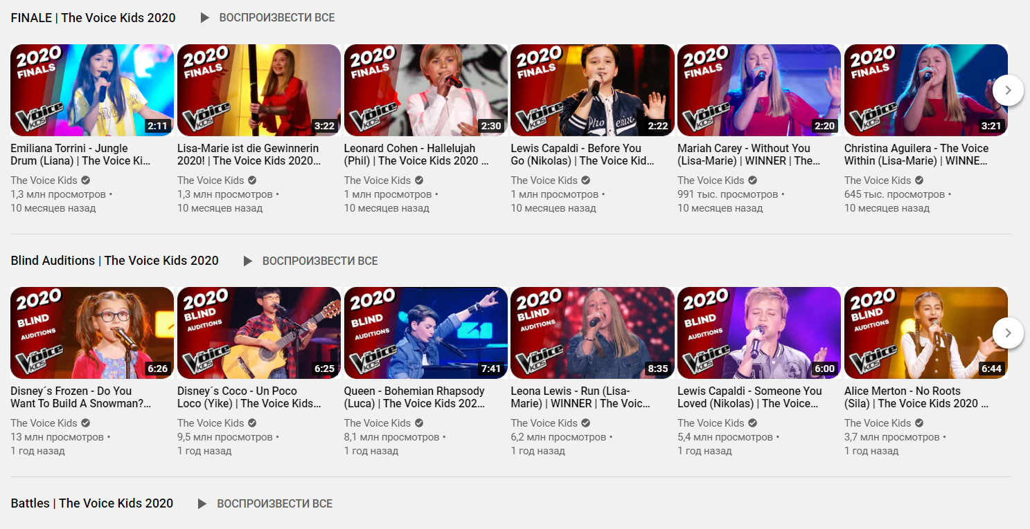 На канале проекта Voice, например, видео с разных этапов собраны в соответствующие плейлисты