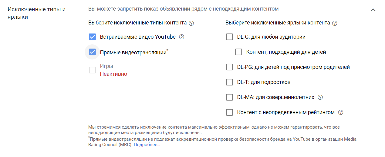 Не нужно забывать про дополнительные настройки. Можно исключить показы объявлений в определенных типах контента, ограничить частоту или время таких показов.