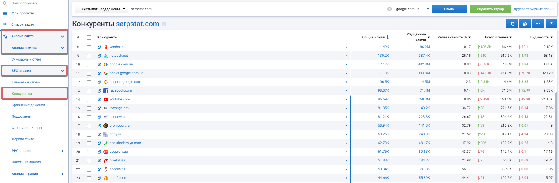 Также найти прямых конкурентов своего сайта, чтобы в дальнейшем отследить их активность на Youtube можно с помощью Serpstat. Для этого достаточно ввести адрес сайта в поисковую строку, выбрать регион и нажать «Поиск». Сервис покажет конкурирующие ресурсы, стратегии которых вам необходимо изучить.