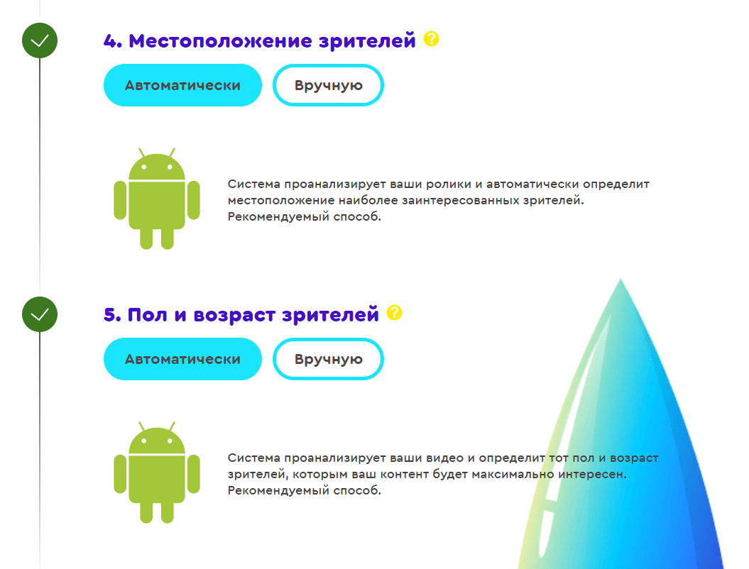 - Пол, возраст и гео заинтересованных зрителей.