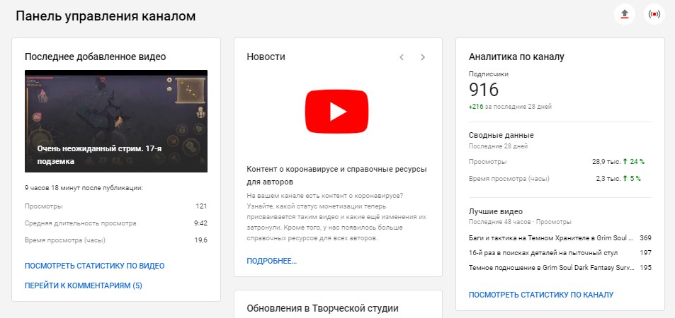 На эту страницу вы попадаете после того, как зайдете в «Творческую студию YouTube». Здесь показывают основные данные.