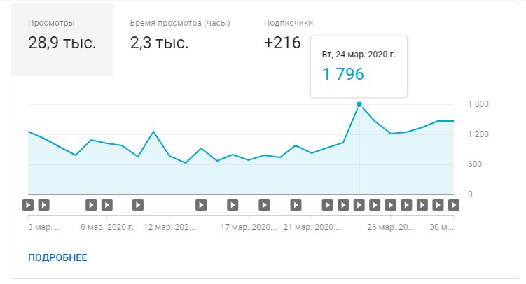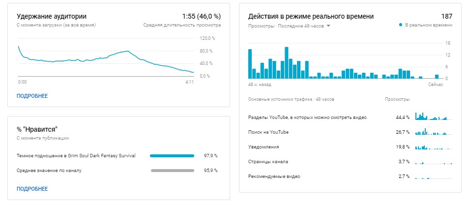 Сразу можно оценить, смотрят ваш последний ролик до конца или нет. Если досматривают плохо, при этом мало времени просмотра — подумайте, как снимать более интересные ролики. Тут же, кстати, можно посмотреть более подробную статистику по видео или глянуть комментарии.