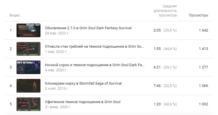 Чуть ниже расположен список лучших видео за все время. Можно посмотреть среднюю длительность просмотра и число просмотров, проанализировать, что объединяет топовые видео, и снимать в будущем ролики с такой же подачей или в таком же формате.