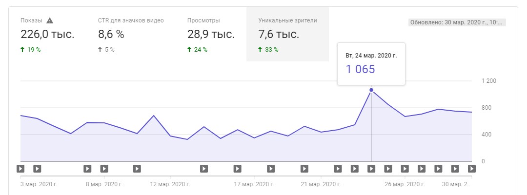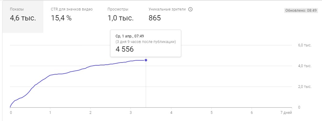 Кривая в графике показывает число показов: если они не растут, возможно, вы недостаточно оптимизировали видео