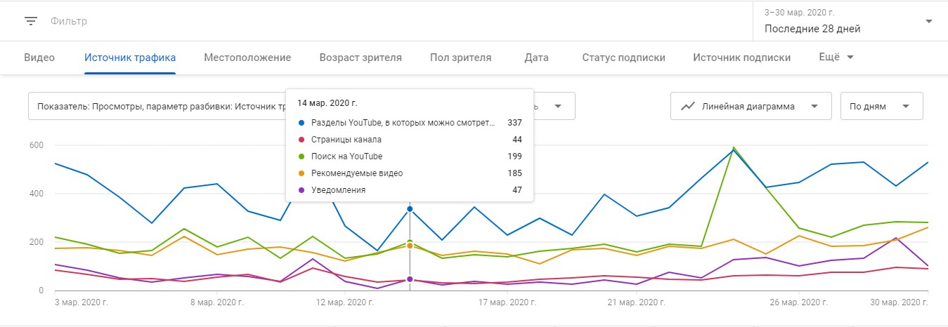 - в «Источниках трафика» — откуда люди приходят на ваше видео и когда они его смотрят.