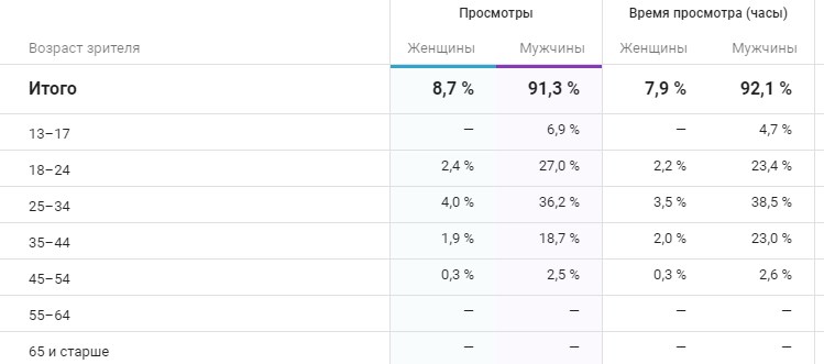 Здесь, например, видно, что ролик смотрят только молодые мужчины