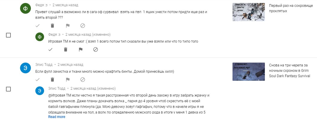 В этом разделе «Творческой студии YouTube» показаны все комментарии: опубликованные, находящиеся на проверке и отмеченные как спам. Можно здесь же отвечать на них, ставить отметки «Нравится» или удалять какие-то реплики.