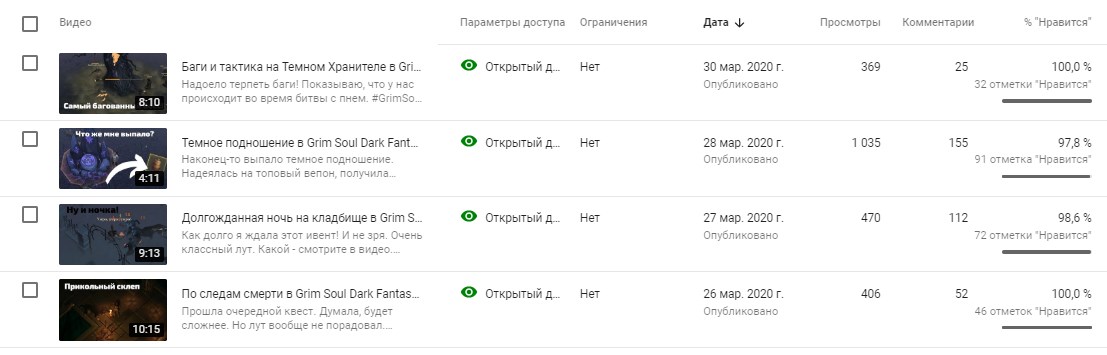 В этом разделе есть информация обо всех видео. Сразу можно увидеть параметры доступа, ограничения, дату публикации, число просмотров и комментариев, процент отметок «Нравится».