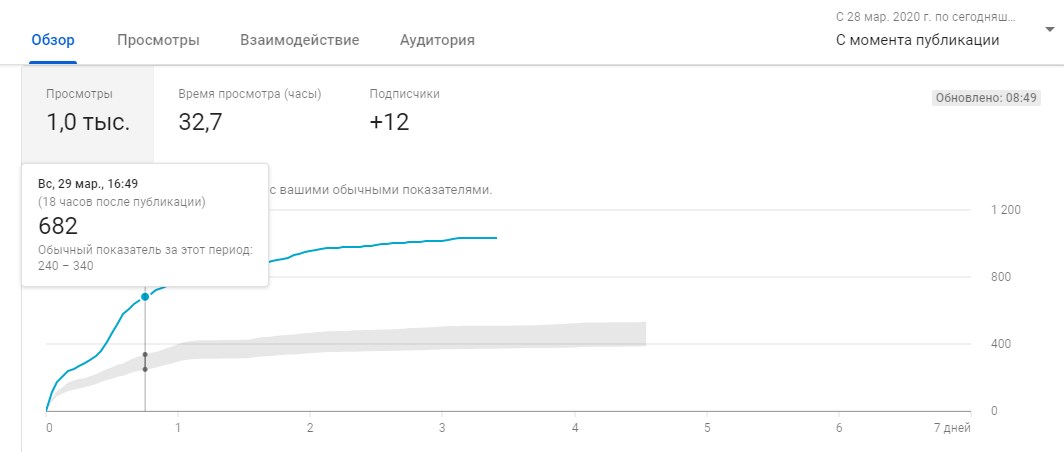 «Обзор». Можно увидеть количество просмотров, время просмотра и число пользователей, подписавшихся на канал сразу после просмотра этого ролика. На графике показано число просмотров в каждый конкретный день и сравнение со средними показателями на канале. Самое популярное видео можно дополнительно продвигать, например, через Utify – это даст еще больше просмотров.