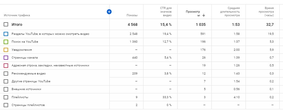 Тут видно, что большинство зрителей нашли ролик на YouTube, а 176 просмотров канал получил от подписчиков благодаря уведомлениям