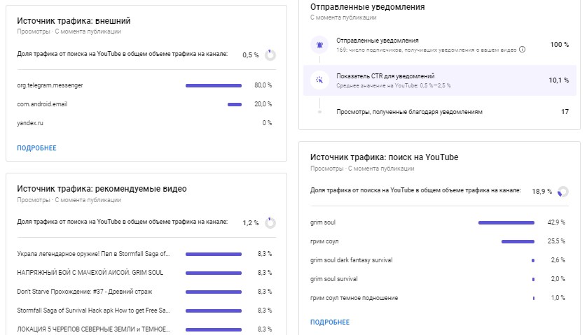 Тут же, в источниках трафика, можно посмотреть доставляемость уведомлений и сравнить показатель со средними по YouTube. А еще — изучить детально внешние источники: например, можно понять, что вашими роликами делятся в мессенджерах или публикуют их на сайтах. Один из самых интересных показателей — ключевые слова, по которым находят ваш ролик: смотрите на них и в будущем прописывайте подходящие ключи в тегах.