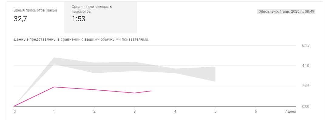 Синяя кривая — число просмотров этого ролика, серая — среднее число просмотров для других роликов. Можно переключиться на время просмотра, «Творческая студия» построит график и для него