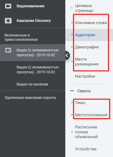 - Места размещения. Здесь можно настроить показ объявлений на определенных каналах, видео, приложениях, сайтах и других местах размещения.