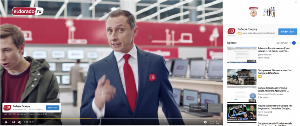 Подходит для продвижения собственных видео или рекламы определенных продуктов с помощью видеороликов, загруженных на ваш YouTube-канал. Video Discovery позволяет рекламировать полноценные видео длительностью от 3-х минут до часа. Такие ролики не встраиваются в чужие видео, а отображаются на YouTube как обычные ролики, только с пометкой «Реклама».